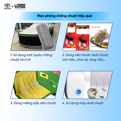 Trên đây là một số phương pháp thông dụng được nhiều chủ xe lựa chọn để diệt chuột. Tuy nhiên, các biện pháp đều có ưu, nhược điểm và độ hiệu quả tùy thuộc vào tập tính của chuột. Vì thế, bạn có thể phải dùng nhiều cách để đuổi chuột, đồng thời cần lưu ý khi dùng các loại hoá chất, dụng cụ có thể ảnh hưởng sức khoẻ con người, cháy nổ.