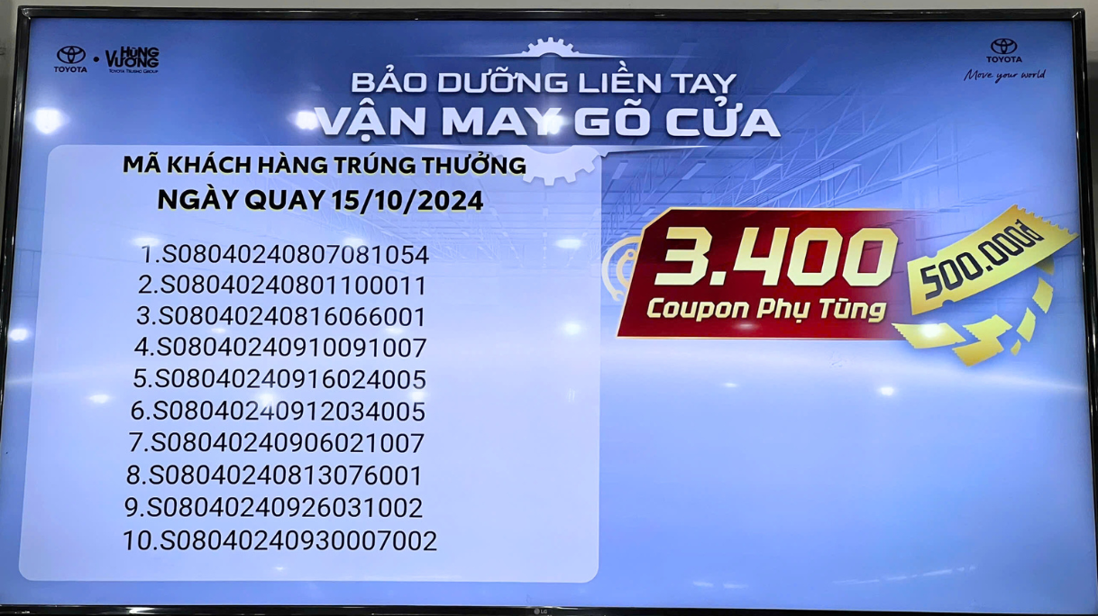 Thông Báo Khách Hàng Trúng Thưởng Chương Trình "Bảo Dưỡng Liền Tay – Vận May Gõ Cửa" Tại Toyota Hùng Vương (Lần 4-15/10/2024).