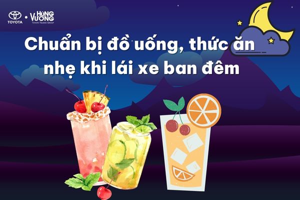 Trước khi lái xe vào ban đêm, thường dễ làm cơ thể mệt mỏi và gây ra cơn buồn ngủ. Vì vậy, nếu bạn chuẩn bị sẵn một ít đồ uống như trà, cà phê và các loại thức ăn nhẹ dưới 100 calo, cơ thể sẽ được cung cấp đủ chất dinh dưỡng, giúp bạn duy trì trạng thái tỉnh táo khi lái xe. Không nên sử dụng các loại đồ ăn chứa nhiều chất béo, muối, đường... bởi chúng có thể gây ra cảm giác đầy bụng và mệt mỏi khi lái xe.