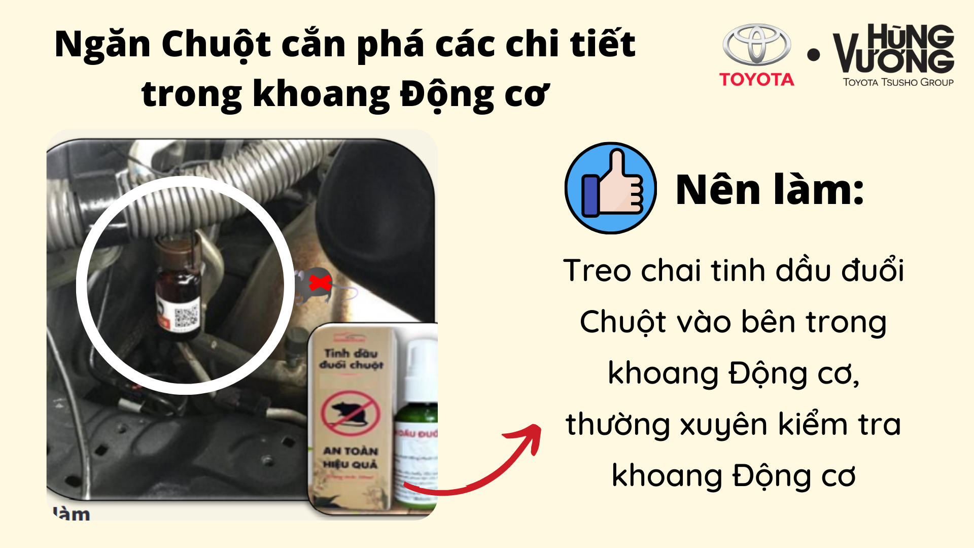 Bạn nên treo chai tinh dầu đuổi chuột vào bên trong khoang động cơ, mùi của sản phẩm này sẽ làm chuột sợ hãi và bỏ chạy. thường xuyên kiểm tra động cơ.