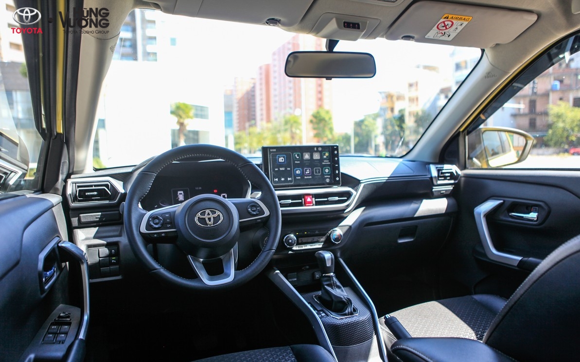 Nội thất Toyota Raize có thiết kế góc cạnh tương tự bên ngoài, với tông màu đen chủ đạo kết hợp cùng các chi tiết màu kim loại ở cửa gió điều hòa, tay nắm cửa hay trung tâm táp-lô.