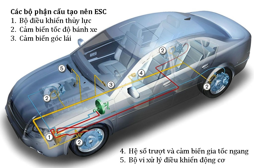 ESC được cấu thành từ 5 bộ phận chính, tín hiệu từ các cảm biến gia tốc ngang ở thân xe, cảm biến tốc độ ở các bánh xe và góc đánh lái… được thu thập để xác định trạng thái chuyển động thực tế. Khi truyền tới bộ vi xử lý điều khiển trung tâm, máy tính sẽ so sánh kết quả với góc quay vô lăng, từ đó đưa ra các lệnh điều khiển phanh hoặc giảm công suất giúp xe nhanh chóng trở về trạng thái theo đúng ý muốn của người lái.