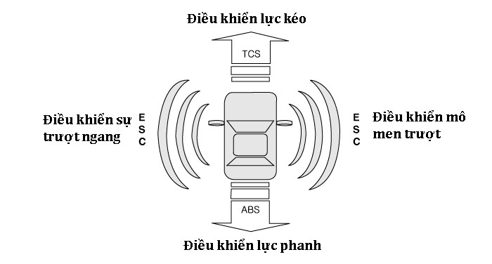 goài ra, ESC còn gắn bó mật thiết với hệ thống chống trượt TCS và phân phối lực phanh điện tử EBD. Nếu ABS làm nhiệm vụ điều khiển quá trình phanh hãm xe (theo chiều dọc), TCS điều khiển lực kéo khi xe tiến về phía trước (theo chiều dọc), EBD điều khiển lực phanh tại mỗi bánh xe thì ESC có chức năng kiểm soát độ cân bằng và ổn định của xe khi xảy ra hiện tượng bị văng đuôi, trượt ngang lúc vào cua hoặc do đánh lái đột ngột ở tốc độ cao.