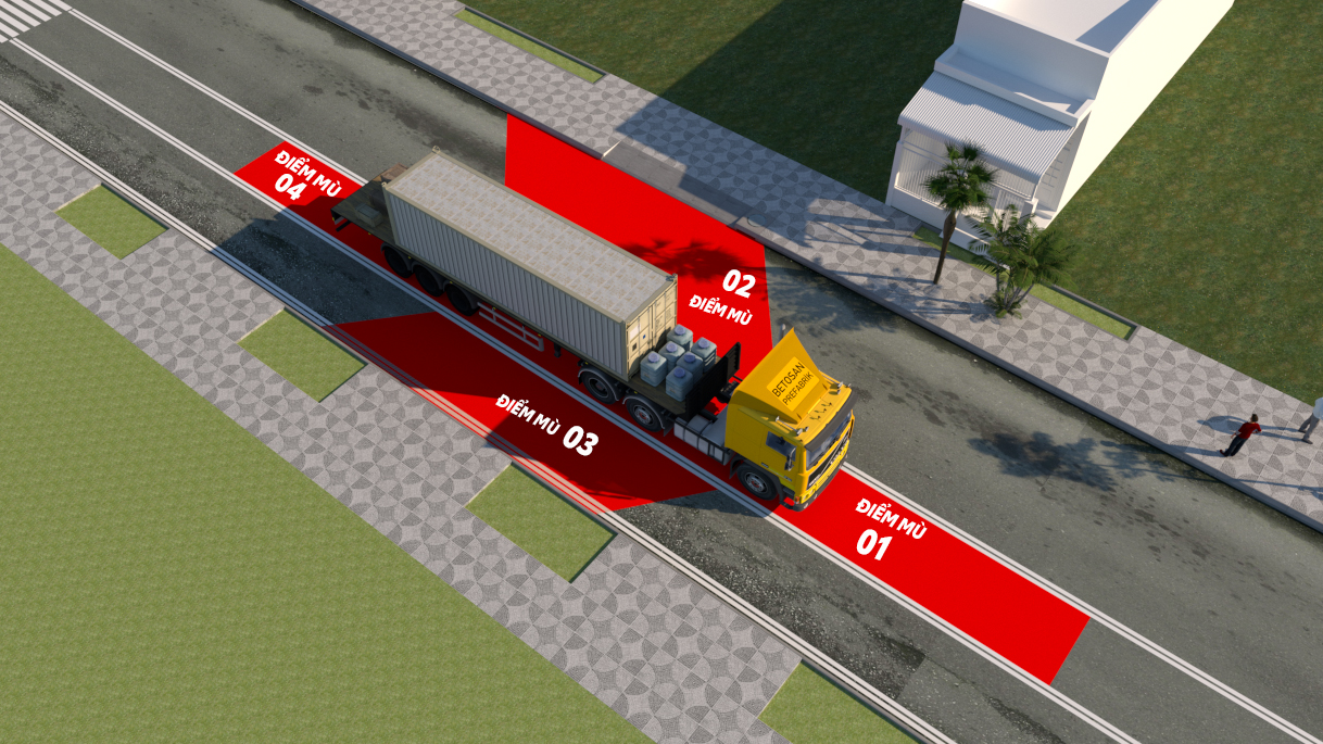 Dù trang bị hệ thống gương chiếu hậu “khủng” nhưng xe tải lớn, xe container vẫn có nhiều vùng mù rất lớn quanh xe, đặc biệt là hai bên hông xe. Do đó tuyệt đối không duy trì tốc độ chạy song song với xe tải lớn, xe container. Bởi rất dễ lọt vào vùng mù và sẽ rất nguy hiểm, khi xe chuyển làn, chuyển hướng.