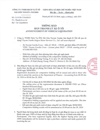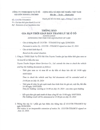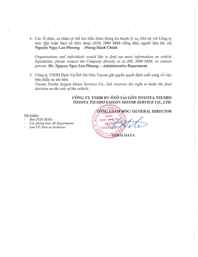 Thông báo thanh lý xe Toyota đã qua sử dụng Toyota Hùng Vương