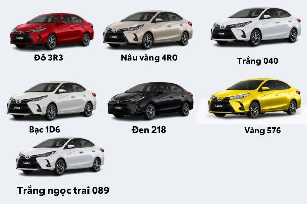 Toyota Vios có 7 màu: đen (218), bạc (1D4), nâu vàng (4R0), đỏ (3R3), trắng (040), trắng ngọc trai (089), vàng (576).Khách hàng có thể tự do lựa chọn màu sắc dựa theo sở thích hoặc mệnh của mình.