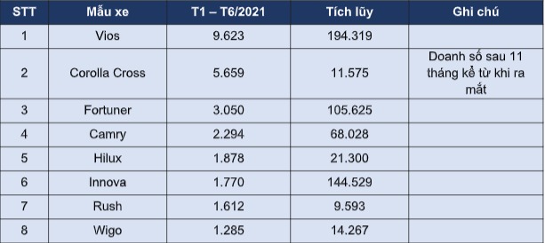 Nửa đầu năm 2021, Toyota Việt Nam đã xuất xưởng 19.678 xe, đưa số sản xuất tích lũy đạt 593.770 xe.