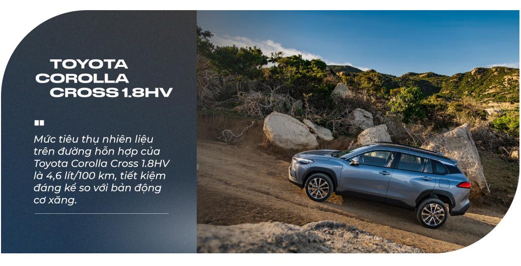 Theo thông số từ nhà sản xuất, mức tiêu thụ nhiên liệu trên đường đô thị, đường trường và đường hỗn hợp của Corolla Cross 1.8HV lần lượt là 3,7, 4,5 và 4,2 lít/100 km, trong khi với bản 1.8V, các con số tương ứng là 10,3, 6,1 và 7,6 lít/100 km. Qua kiểm nghiệm thực tế, Zing News ghi nhận mức tiêu thụ nhiên liệu trên đường hỗn hợp của Toyota Corolla Cross 1.8HV là 4,6 lít/100 km, tiết kiệm đáng kể so với bản động cơ xăng.
