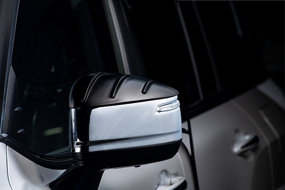 Ốp gương 2 bên phối giữa chất liệu nhựa mạ chrome và nhựa đen mờ.