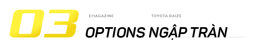 Theo Hoàng Giang, định kiến “Toyota nghèo nàn trang bị” không tồn tại trên Raize. Một mẫu SUV A+ Nhật Bản với đầy đủ màn hình giải trí cảm ứng 9 inch, kết nối Apple CarPlay và Android Auto. Cụm đồng hồ tích hợp màn hình 7 inch với 4 chế độ hiển thị và khả năng ghi nhớ, thông báo ngày kỷ niệm. Thậm chí, hãng xe Nhật Bản còn trang bị cho Raize tính năng hiển thị góc nghiêng dù đây chẳng phải một mẫu SUV off-road chuyên nghiệp.