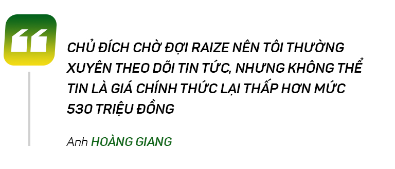 “Chủ đích chờ đợi Raize nên tôi thường xuyên theo dõi tin tức, nhưng không thể tin là giá chính thức lại thấp hơn mức 530 triệu đồng”, Hoàng Giang nói. Sau khi biết giá, nam thanh niên 28 tuổi đặt cọc ngay, với giá bán 527 triệu đồng, Raize sẽ trở thành cơn sốt tại Việt Nam.
