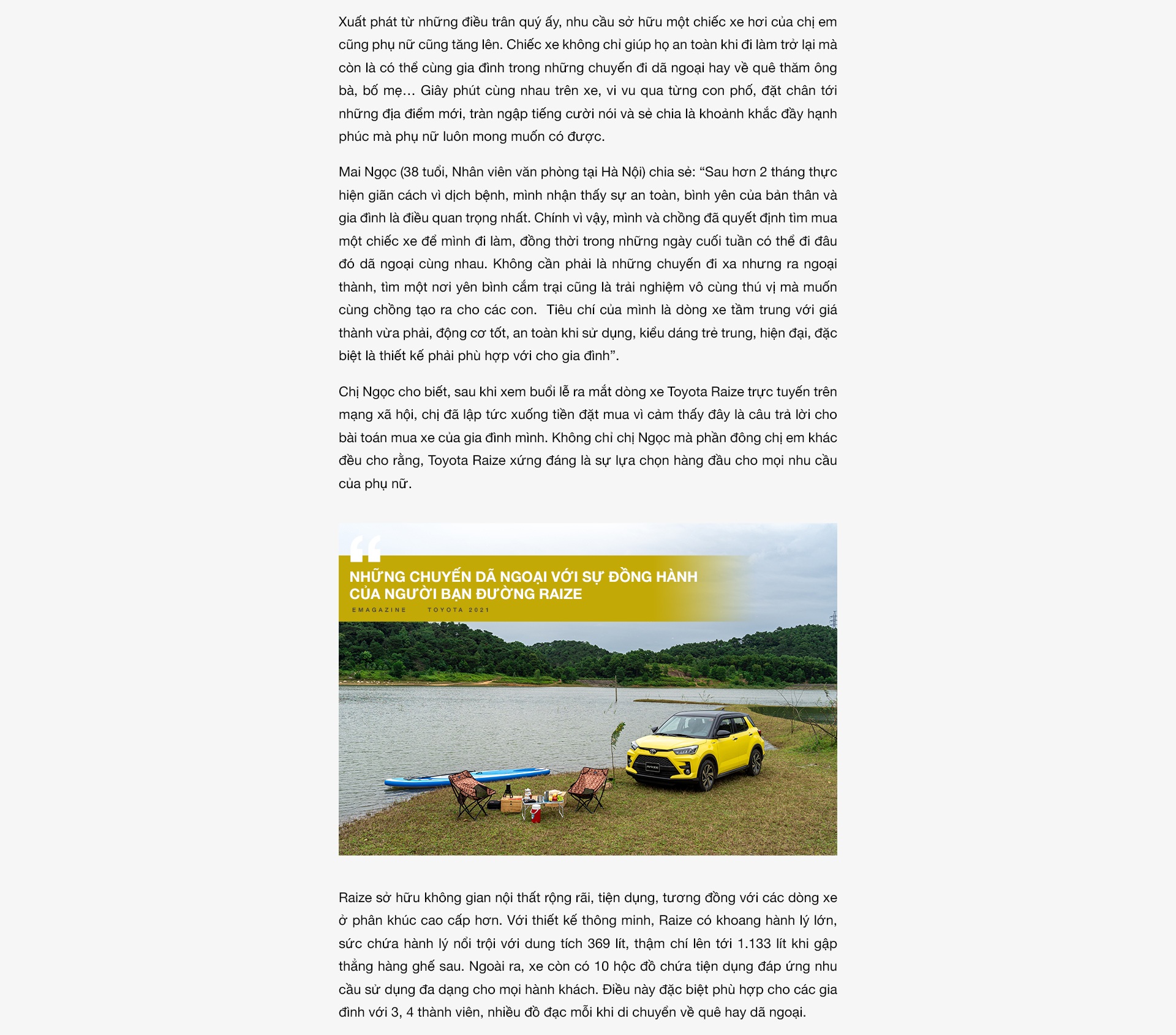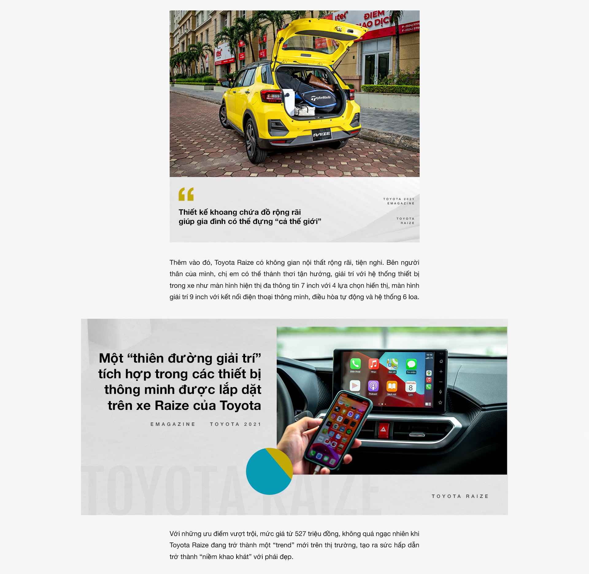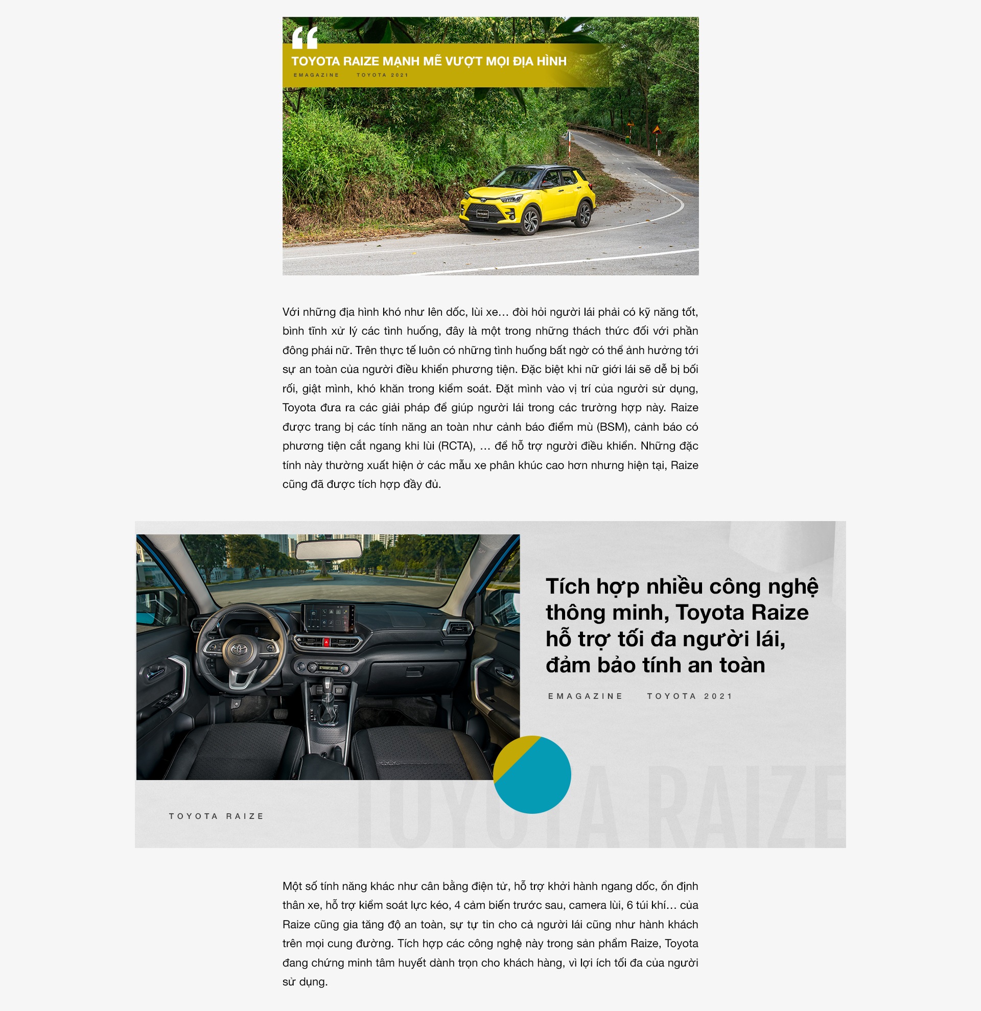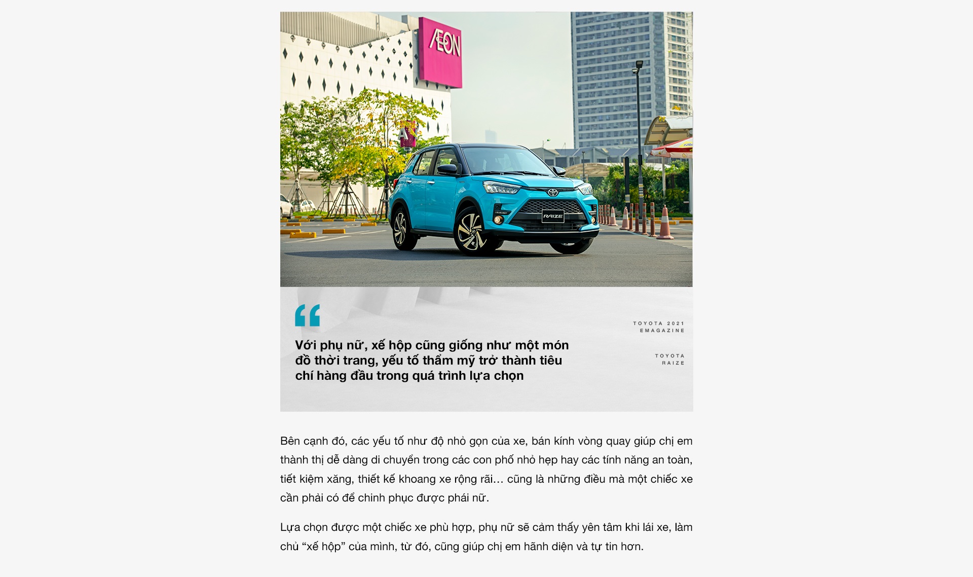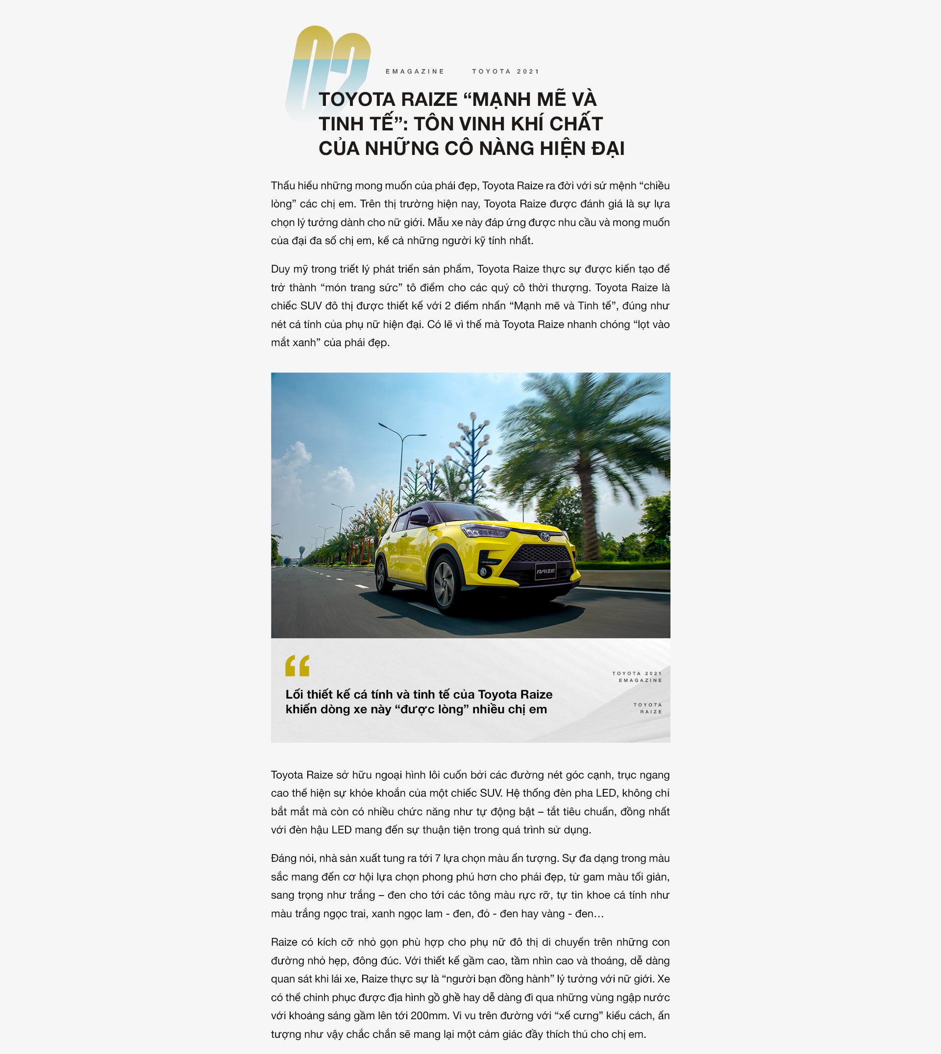 Không chỉ là phương tiện di chuyển, chiếc xe hơi còn đóng vai trò như một "món đồ chơi thời trang, thể hiện gu thẩm mỹ và cá tính của từng chủ nhân. Sở hữu nhiều ưu điểm vượt trội và sự tinh tế, Toyota Raize tạo sức hút mạnh mẽ góp phần nâng tầm chất sống cho các quý cô hiện đại.