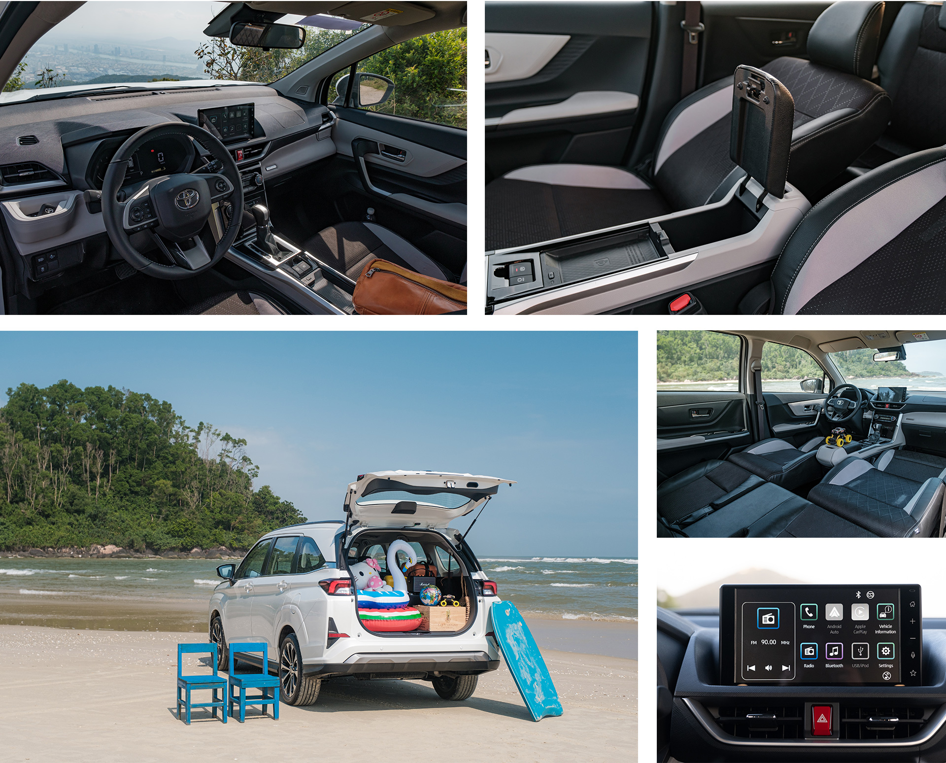 Mua xe 7 chỗ, Thiên cũng nhắm tới mục đích đưa hai gia đình nội, ngoại đi chơi. Toyota Veloz Cross là lựa chọn vì không gian cabin đủ thoải mái cho 7 người ngồi, cùng hệ thống điều hòa làm mát nhanh, phù hợp với khí hậu khu vực phía Nam. Các tiện nghi như màn hình trung tâm 9 inch hay dàn âm thanh 6 loa giúp mọi người trên xe đều cảm thấy thư giãn.