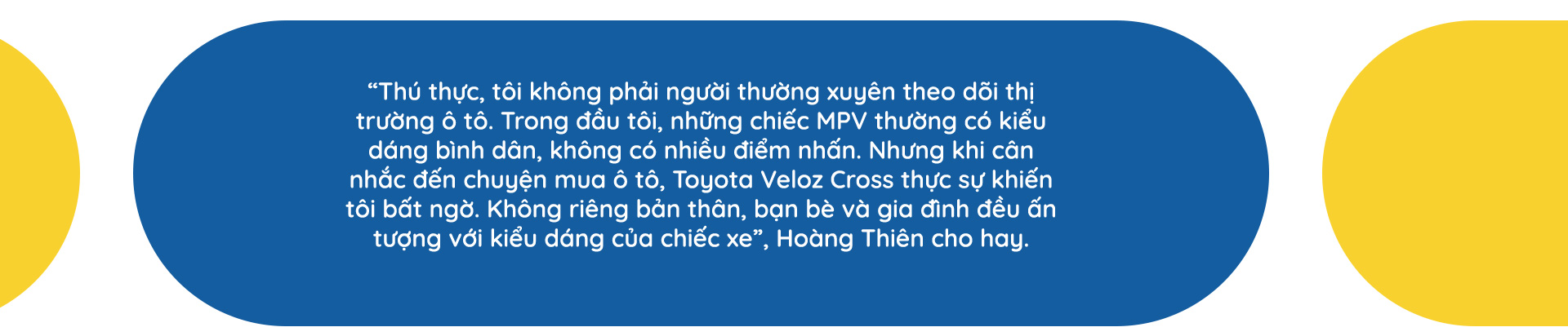 Thuộc thế hệ 9X năng động, Hoàng Thiên chọn Toyota Veloz Cross là người bạn đồng hành giúp bản thân và gia đình tận hưởng cuộc sống một cách trọn vẹn.